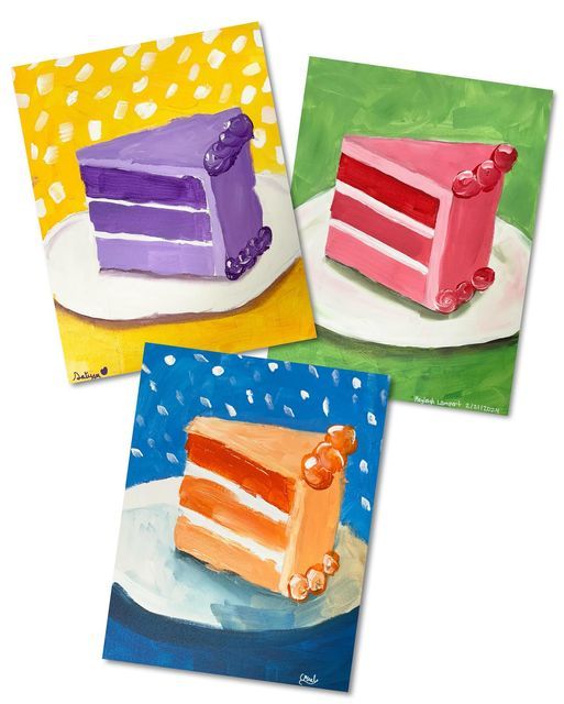 Artists will then create a fun Piece of Cake painting, using complementary colors and simple perspective techniques to make their artwork pop with contrast and depth. 🍰